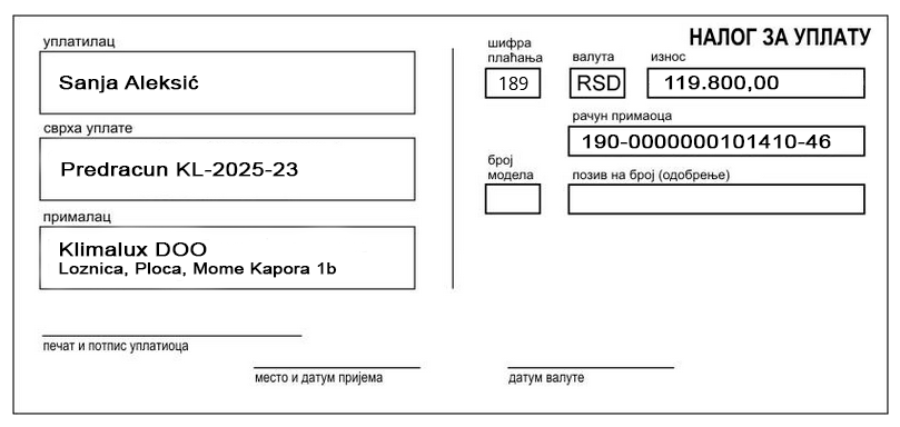 Lično preuzimanje moguće je iz magacina u Beogradu. Oprema se nalazi na različitim magacinima. Nakon uplate računa, na vaš e-mail šaljemo fiskalni račun i instrukcije za lično preuzimanje.